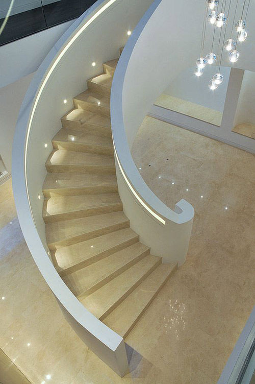 Với cầu thang thiết kế hình xoắn ốc: Đây là thiết kế giúp tiết kiệm tối đa không gian của ngôi nhà. Có rất nhiều cách để không gian cầu thang trở nên tinh tế hơn bằng các loại đèn chiếu sáng. Để làm nổi bật nên thiết kế thanh lịch của cầu thang, bạn nên chọn những loại đèn chạy dọc hai bên tường chắn, có khả năng uốn lượn một cách dễ dàng. Một sản phẩm mà bạn có thể lựa chọn đó chính là đèn dây led trang trí, không những tiết kiệm được không gian, tiết kiệm điện năng sử dụng mà nó còn tạo nên một đường cong ánh sáng tuyệt vời. Một phong cách trang trí vô cùng ấn tượng khác, mang phong cách cổ điển phương Tây đó chính là sử dụng đèn chùm hoa lệ. Nhưng với thiết kế đèn chùm hiện nay, không gian nhà bạn sẽ trở lên lung linh hơn rất nhiều.
