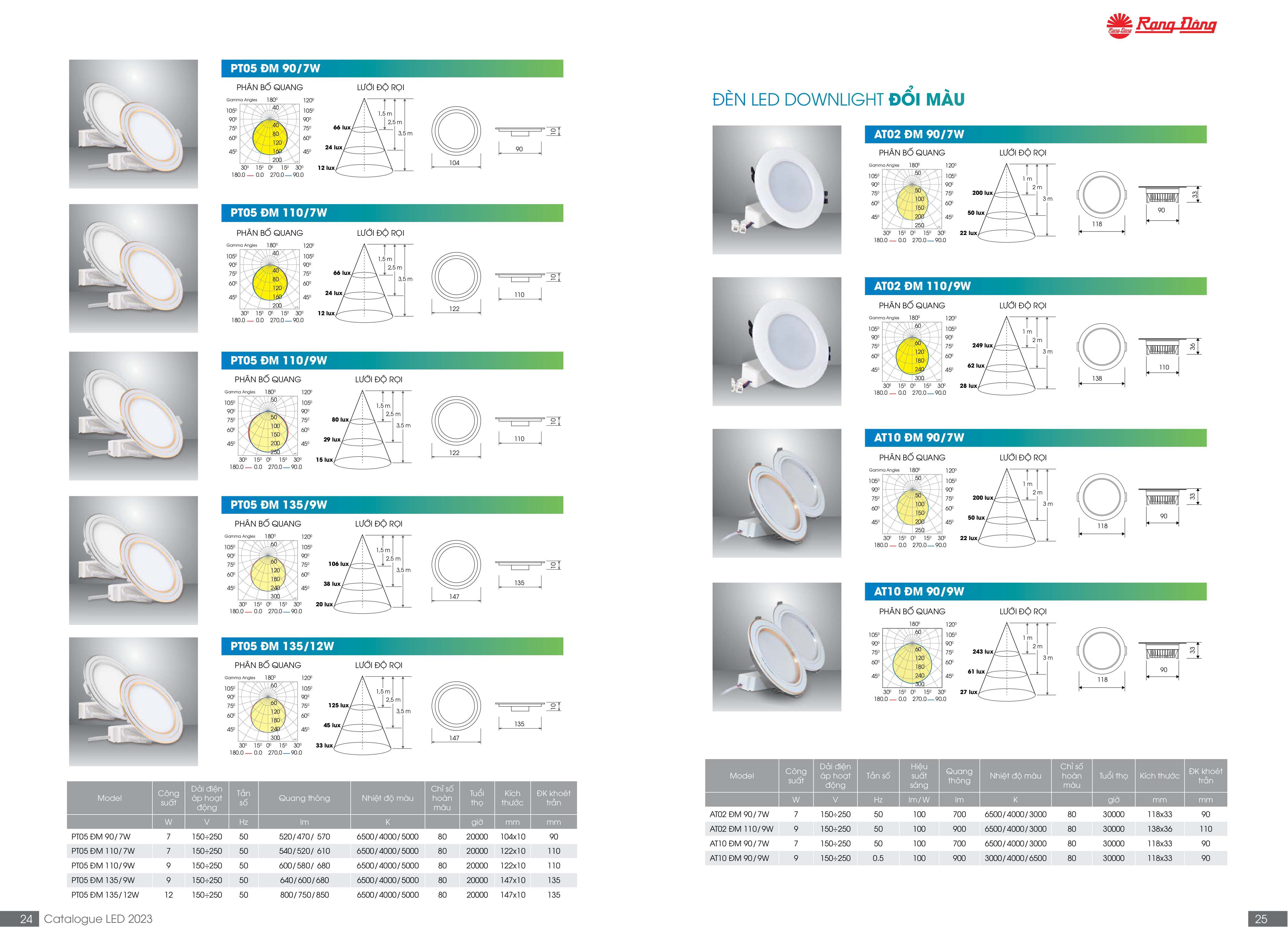 - Đèn LED âm trần đổi màu AT02 ĐM 90/9W Rạng Đông tuổi thọ 20.000 h chiếu sáng, gấp 10 lần so với bóng Huỳnh quang, compact, giúp tiết kiệm 60% điện năng tiêu thụ.