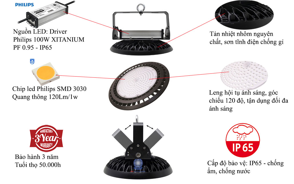 - Đèn LED nhà xưởng UFO 100W Philips Driver : Được gọi tên UFO nhờ hình dáng giống đĩa bay. Sử dụng công nghệ LED cho hiệu quả chiếu sáng cao nhất tính đến thời điểm này.