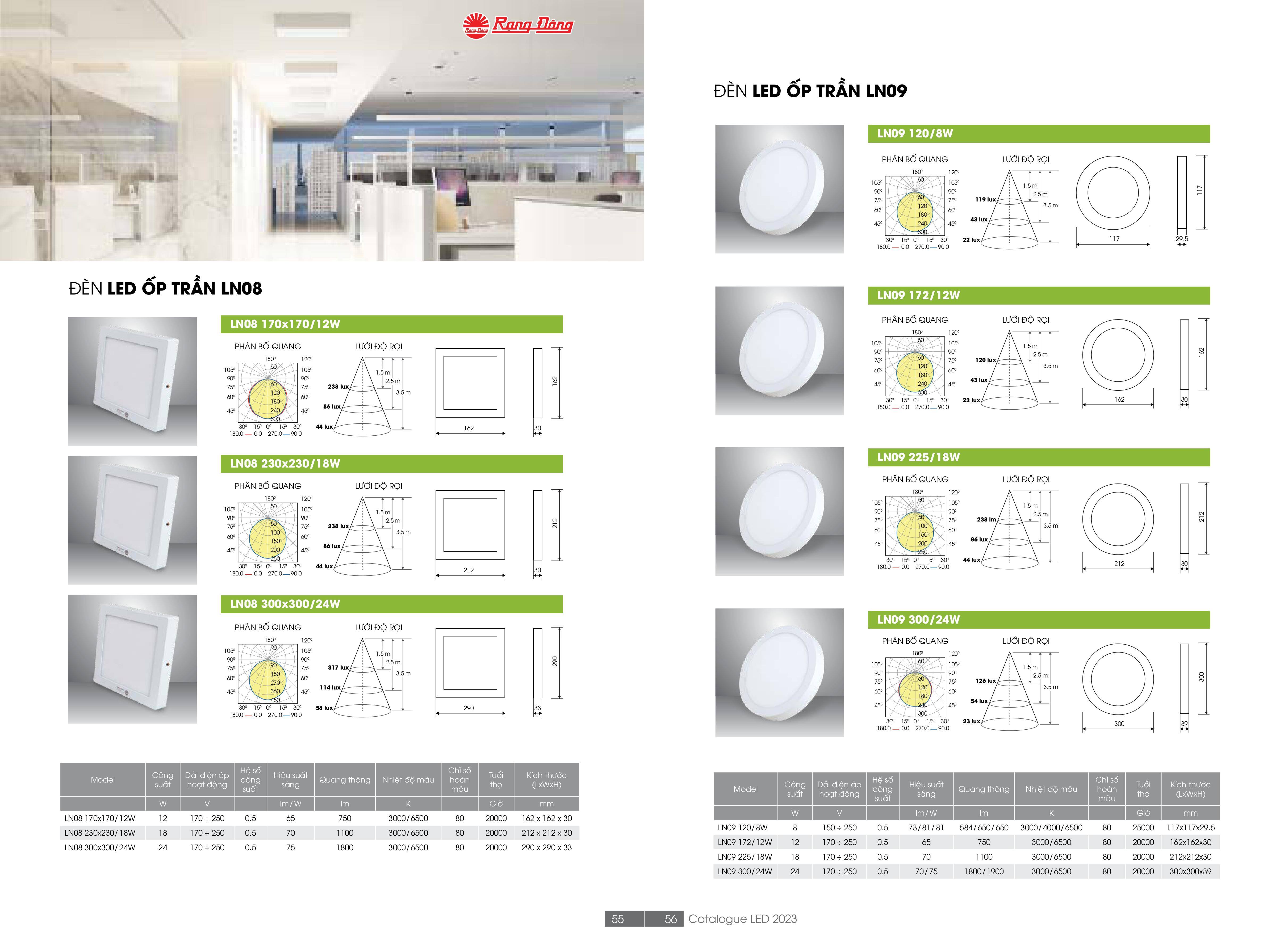 - LN09 172/12W Rạng Đông có thiết kế dáng tròn, đơn giản, với nguyên lý chiếu sáng cạnh, không gây chói sử dụng phù hợp cho nhiều không gian chiếu sáng với sản phẩm tương tự là ốp trần LN09 225/18W và LN09 300/24W.