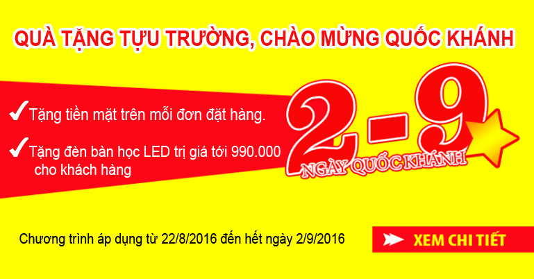 Nhân dịp chào mừng Quốc Khánh 2/9 và ngày tựu trường. Công ty cổ phần thiết bị VMT Việt Nam xin gửi tới chương trình khuyến mại đặc biệt áp dụng cho khách hàng mua hàng tại www.dailydenled.com với chủ đề “Quà tặng tựu trường, chào mừng Quốc Khánh”